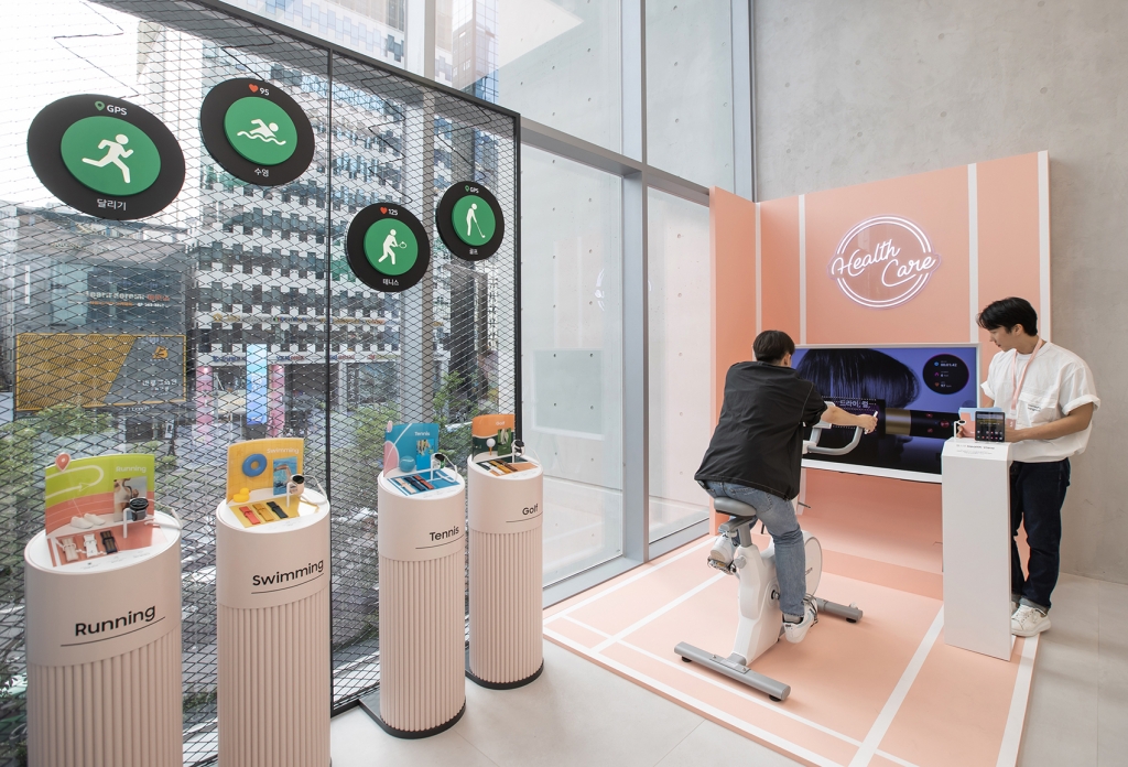 ▲삼성전자가 새로운 콘셉트의 체험형 플래그십 스토어 ‘삼성 강남’을 29일 오픈한다.‘삼성 강남’ 2층 헬스케어 존에서 고객이 갤럭시 워치의 헬스 기능을 체험하고 있다.