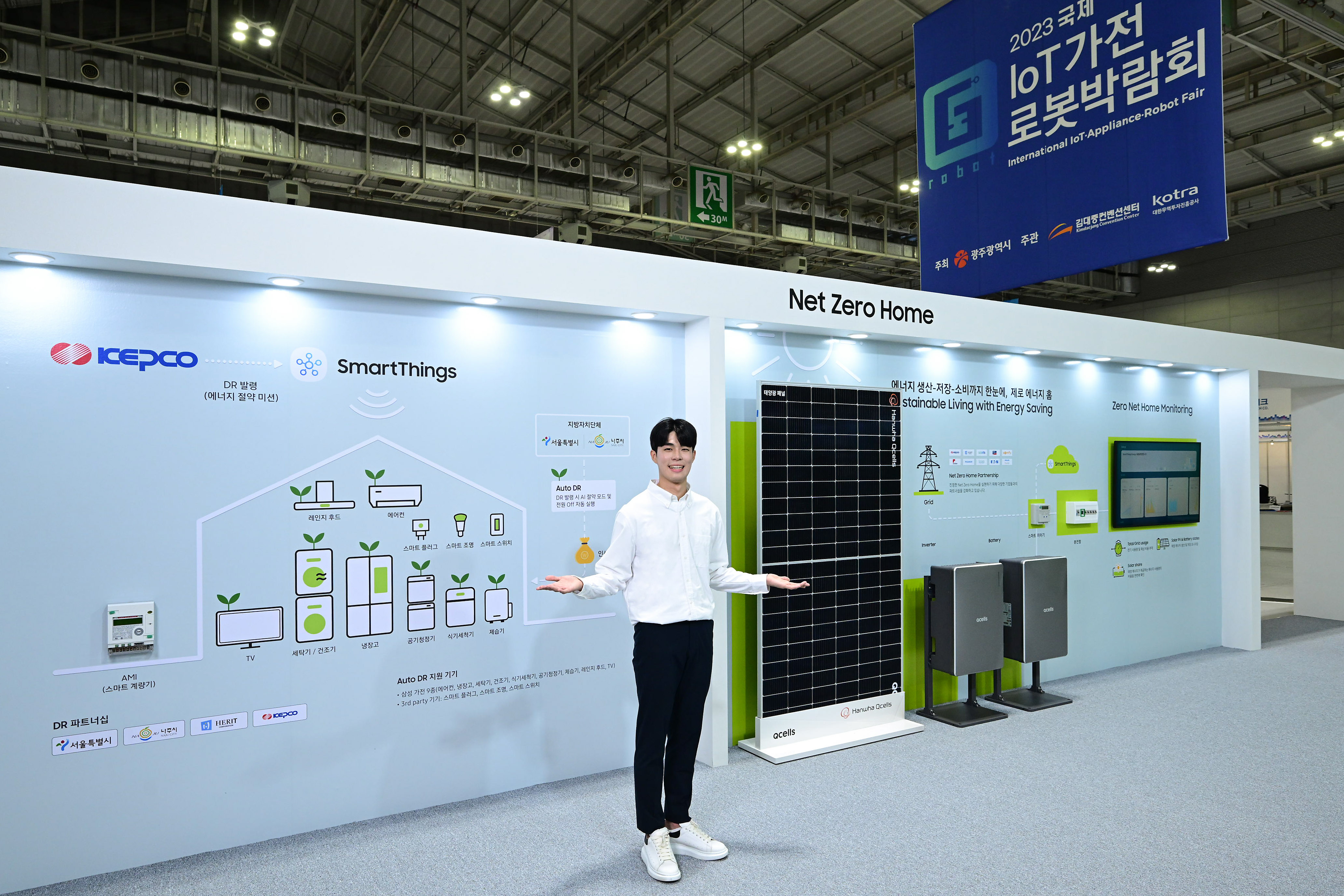▲삼성전자가 29일부터 내달 1일까지 광주광역시 김대중컨벤션센터에서 열리는 ‘2023국제IoT가전로봇박람회’에 참가한다.삼성전자 모델이 29일부터 내달 1일까지 광주광역시 김대중컨벤션센터에서 진행되는 ‘2023국제IoT가전로봇박람회’에 마련된 삼성전자 부스에서 스마트싱스 기반의 ‘넷 제로 홈’을 소개하고 있는 모습