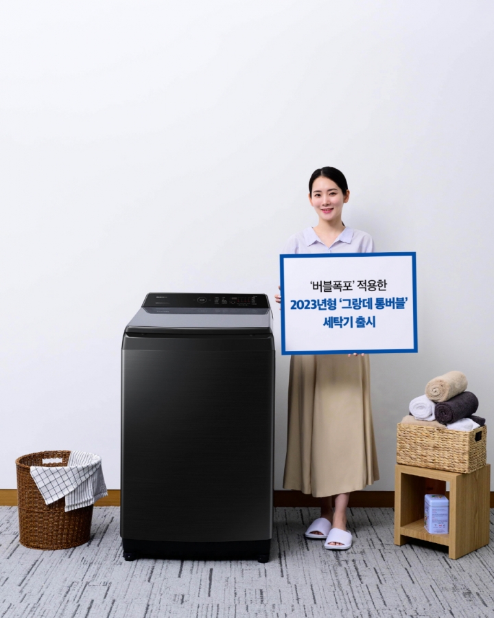 ▲삼성전자가 강력한 세척력을 자랑하는 ‘버블폭포’기능을 전 라인업에 적용한 2023년형 전자동 세탁기 ‘그랑데 통버블’ 신제품을 10일 출시한다. 삼성전자 모델이 전 라인업에 버블폭포를 적용한 ‘그랑데 통버블’ 신제품을 소개하는 모습