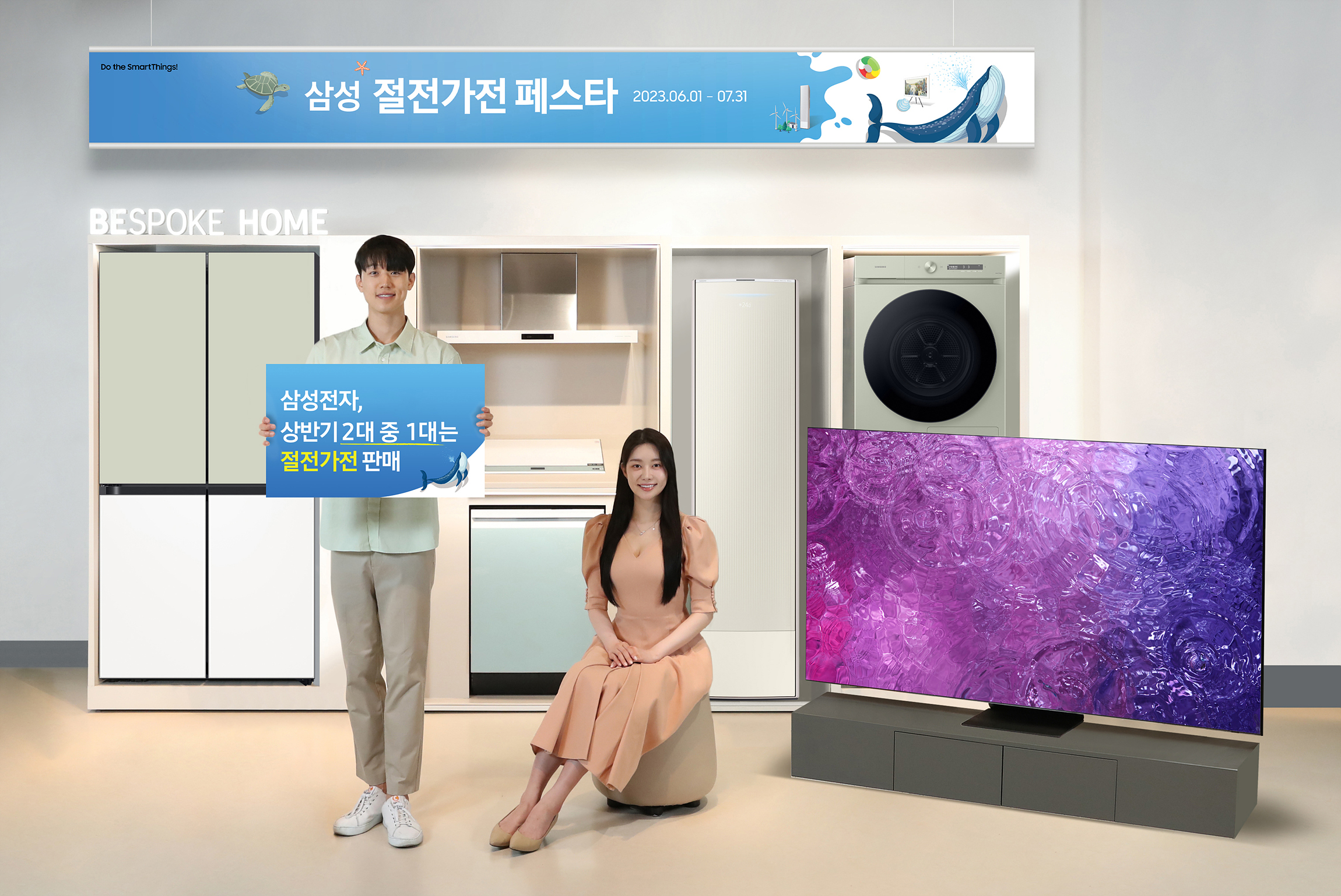 ▲에너지 절감에 관심이 많은 소비자들의 고효율 제품 구매 확대로 삼성전자가 2023년 상반기에 판매한 TV, 냉장고, 김치냉장고, 세탁기, 에어컨, 공기청정기 등의 2대 중 1대는 절전가전인 것으로 나타났다. 삼성전자가 올 상반기에 판매한 TV, 냉장고, 김치냉장고, 세탁기, 에어컨, 공기청정기 등의 2대 중 1대는 절전가전인 것으로 나타났다. 삼성전자 모델이 절전가전을 소개하고 있는 모습.