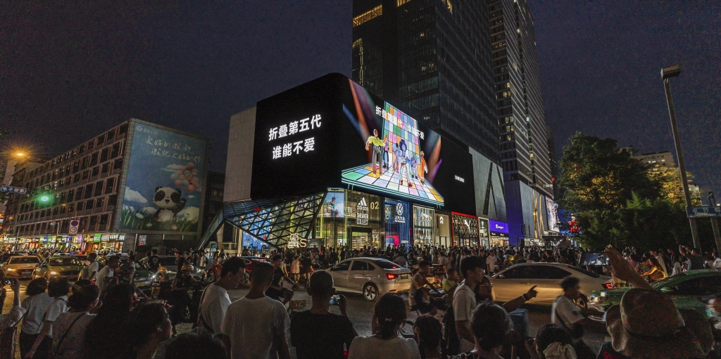 ▲삼성전자가 이달 26일 새로운 갤럭시 제품의 공개를 앞두고 전세계 주요 랜드마크에서 대규모 디지털 옥외 광고를 시작했다.중국 청두 타이쿠리(Tai Koo Li) 지역의 ‘Join the flip side’ 디지털 옥외광고