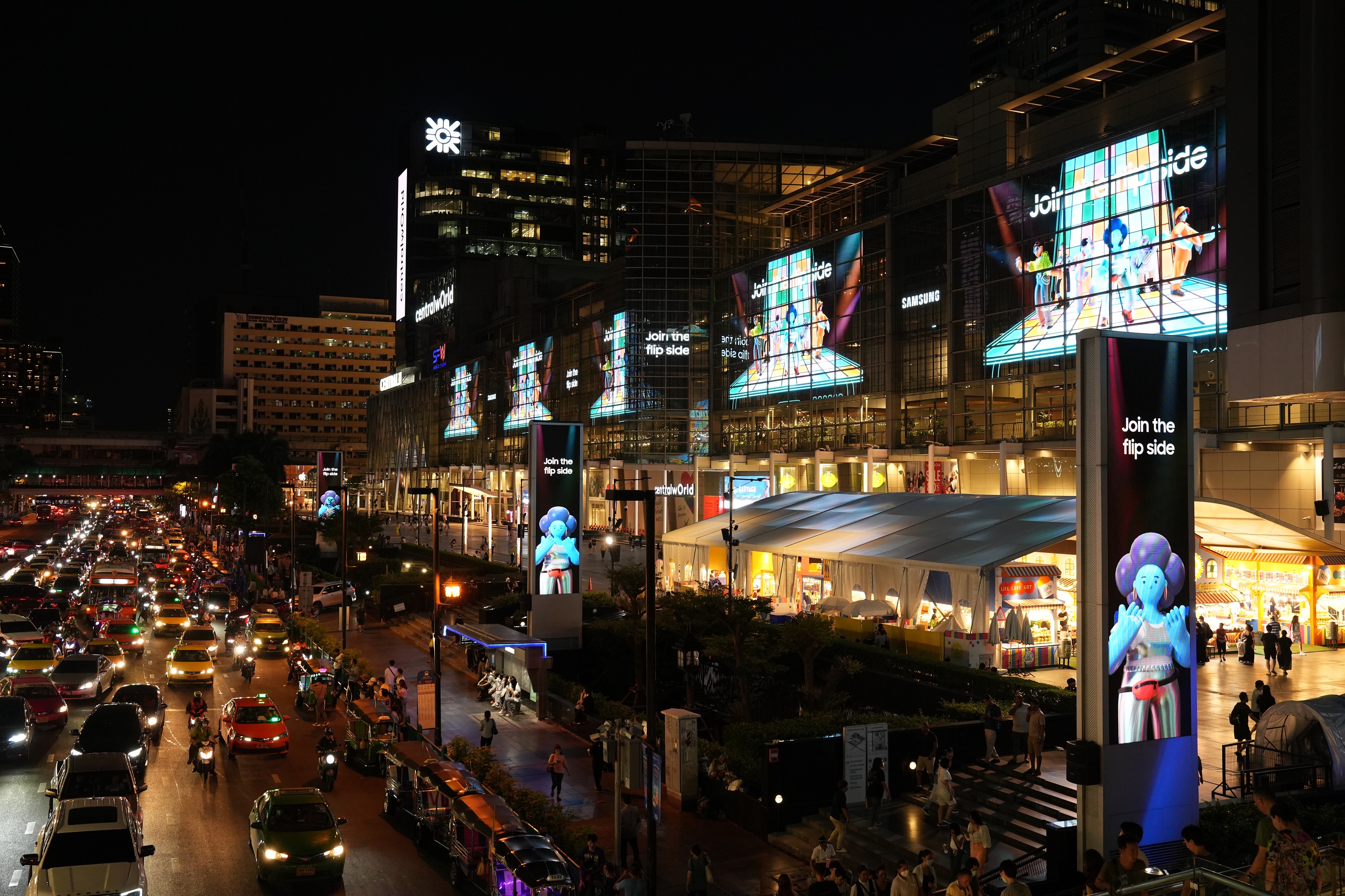 ▲삼성전자가 이달 26일 새로운 갤럭시 제품의 공개를 앞두고 전세계 주요 랜드마크에서 대규모 디지털 옥외 광고를 시작했다.태국 방콕 센트럴월드(CentralwOrld)의 ‘Join the flip side’ 디지털 옥외광고
