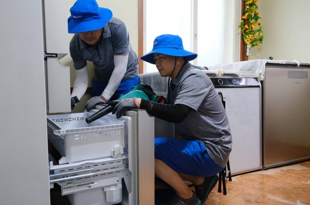 ▲삼성전자서비스가 18일부터 집중 호우로 큰 피해를 입은 공주, 괴산, 오송 일대에 서비스팀을 파견해 ‘수해 복구 특별서비스’를 실시한다.삼성전자서비스 임직원이 침수된 냉장고를 건조 및 세척하는 모습