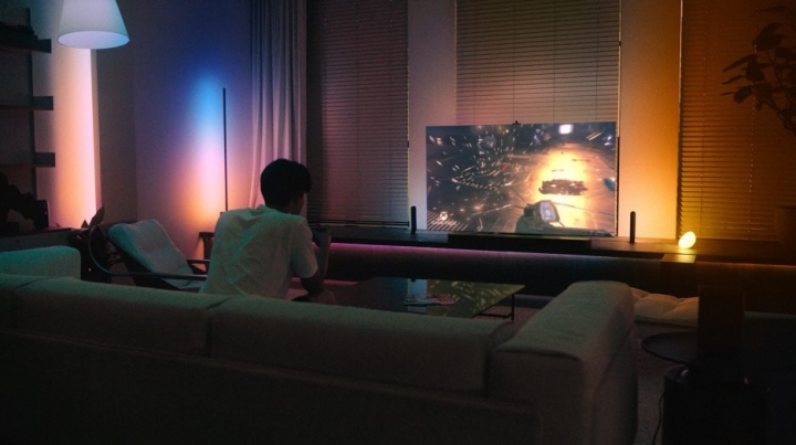 ▲ 손흥민 선수가 ‘스마트싱스 라이프’ 캠페인 영상에서 삼성 스마트싱스에 연동된 ‘휴 싱크’ 기능을 이용해 게임을 즐기는 모습