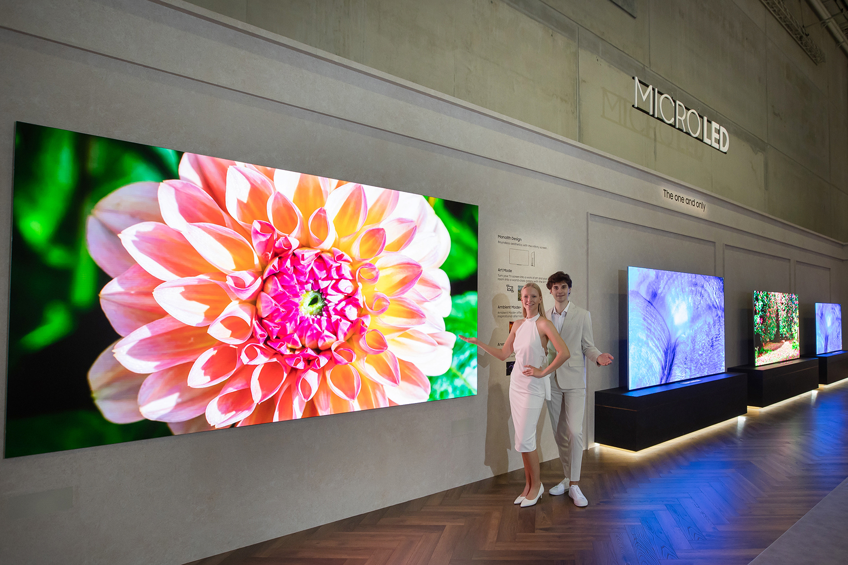▲ IFA 2023가 열리는 메세 베를린(Messe Berlin)에 위치한 삼성전자 전시관에서 삼성전자 모델이 ‘마이크로 LED’를 소개하고 있다.
