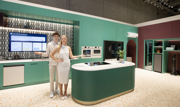 ▲ IFA 2023가 열리는 메세 베를린(Messe Berlin)에 위치한 삼성전자 전시관에서 삼성전자 모델이 비스포크 라이프 체험존을 소개하고 있다.