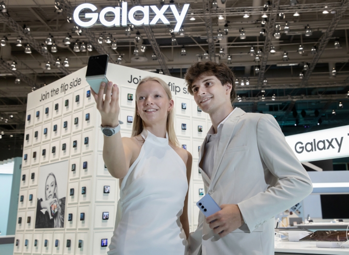 ▲ IFA 2023가 열리는 메세 베를린(Messe Berlin)에 위치한 삼성전자 전시관에서 삼성전자 모델이 ‘갤럭시 Z 플립5ㆍZ 폴드5’를 소개하고 있다.