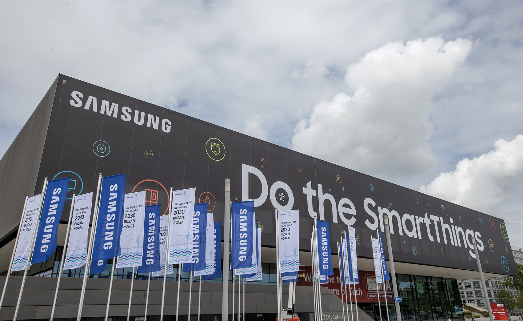▲ 삼성전자가 오는 1~5일(현지시간) 독일 베를린 ‘메세 베를린(Messe Berlin)’에서 열리는 유럽 최대 가전전시회 ‘IFA 2023’에 앞서 삼성전자 전시장이 마련된 ‘시티큐브 베를린(City Cube Berlin)’ 건물 외관에 ‘스마트싱스’를 기반으로 한 의미 있는 연결 경험을 강조하는 ‘Do the SmartThings’를 표현한 옥외 광고를 설치했다.