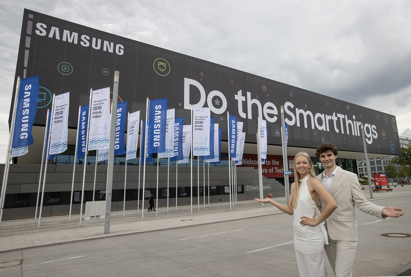 ▲ 삼성전자가 오는 1~5일(현지시간) 독일 베를린 ‘메세 베를린(Messe Berlin)’에서 열리는 유럽 최대 가전전시회 ‘IFA 2023’에 앞서 삼성전자 전시장이 마련된 ‘시티큐브 베를린(City Cube Berlin)’ 건물 외관에 ‘스마트싱스’를 기반으로 한 의미 있는 연결 경험을 강조하는 ‘Do the SmartThings’를 표현한 옥외 광고를 설치했다. 삼성전자 모델이 옥외광고를 소개하고 있는 모습