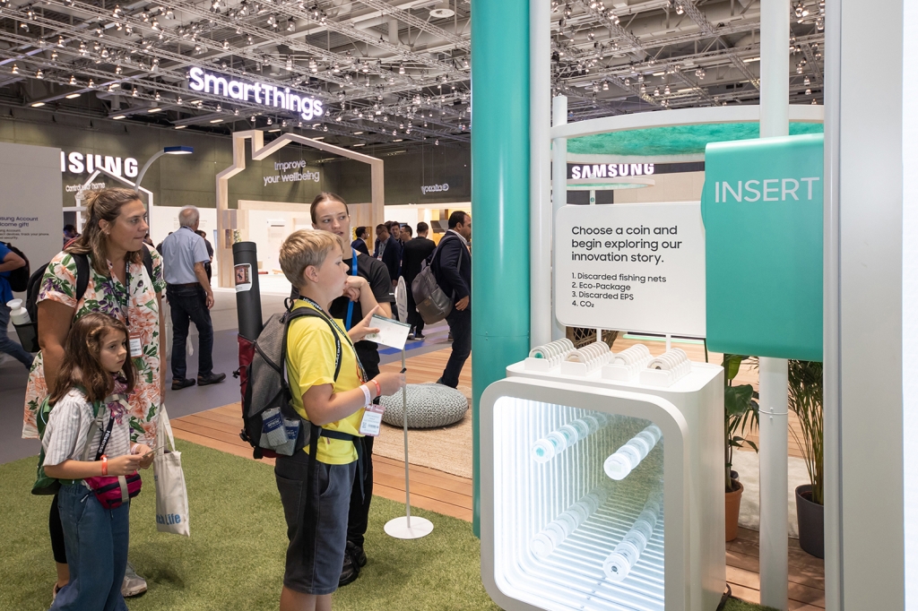 ▲ 관람객이 폐어망, 에코 패키지 등 삼성전자의 노력이 담긴 혁신 스토리들을 체험하고 있다.