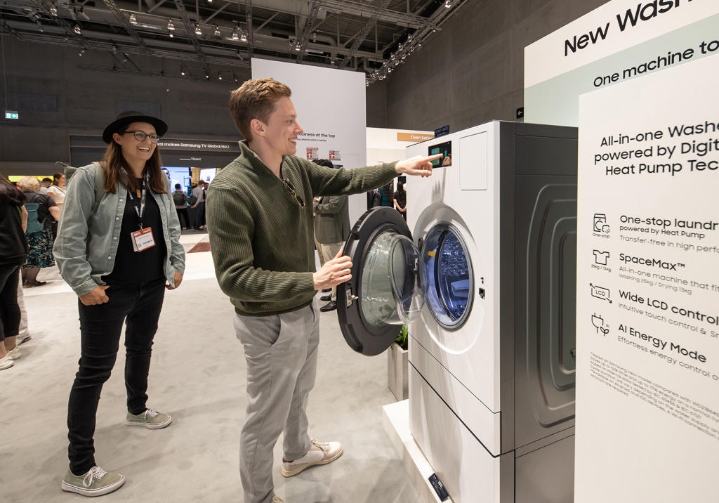 ▲ 관람객이 세탁기 건조기 올인원 제품을 체험하고 있다