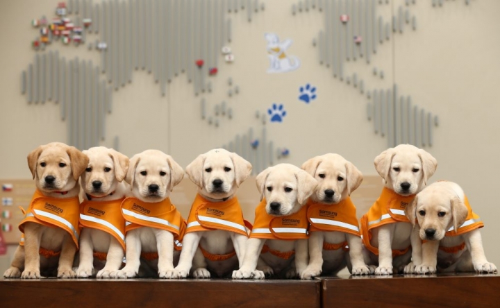 ▲ 한 자리에 모여 포즈를 취한 삼성화재 안내견학교의 예비 안내견들. 안내견은 생후 훈련기간 약 2년과 활동기간 7~8년, 은퇴 후 노후 돌봄 등 약 10년이 넘는 기간에 걸쳐 사람들의 지속적인 관심과 지원이 필요하다.