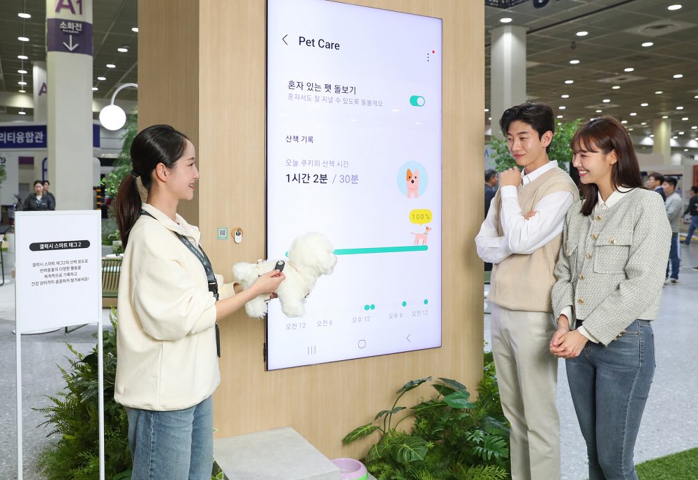 ▲ KES 2023(한국전자전)이 열리는 서울 코엑스(COEX)에 위치한 삼성전자관의 펫 케어존에서 관람객들이 반려동물을 더 세심하고 체계적으로 관리할 수 있는 ‘갤럭시 스마트태그2’와 함께 ‘산책 기록’ 기능을 체험하고 있다.