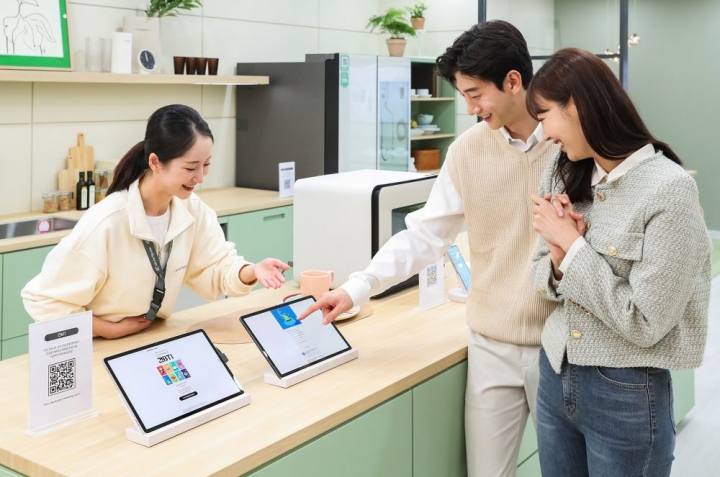 ▲ KES 2023(한국전자전)이 열리는 서울 코엑스(COEX)에 위치한 삼성전자관의 푸드&쿠킹존에서 관람객이 나만의 건강 유형을 확인할 수 있는 ‘건BTI’로 식단을 추천받고 있다.