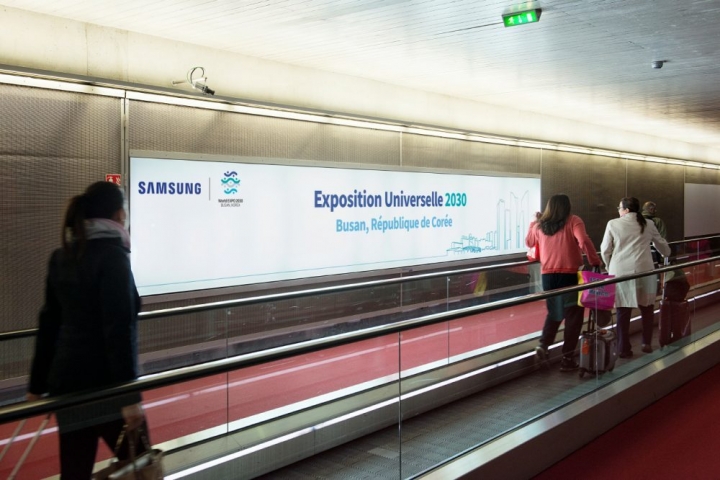 ▲ 삼성전자가 최근 프랑스 파리 샤를드골 국제공항에서 14개의 광고판을 통해 부산엑스포를 알리고 있다.