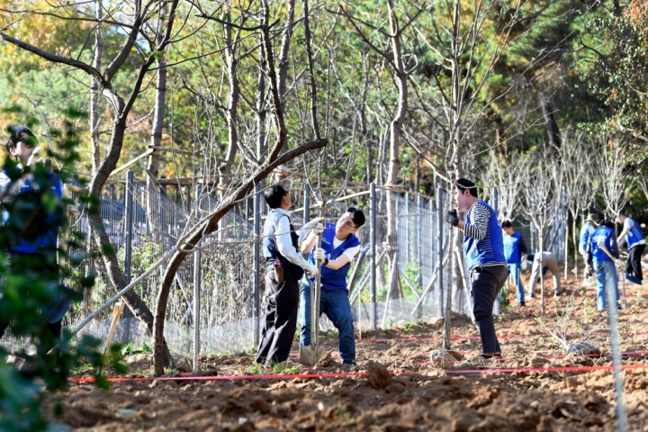 ▲ 삼성생명 임직원들이 지난 2일 서울 은평구 둘레길에서 조경수를 심는 식목 봉사를 하고 있다.