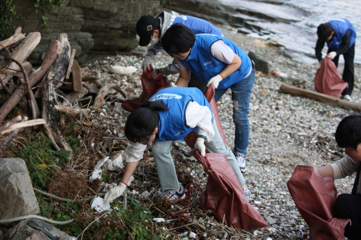 ▲ 삼성중공업 임직원들이 지난 5일 경남 거제도 조선소 인근 해안에서 쓰레기 수거 봉사활동에 참여하고 있다.