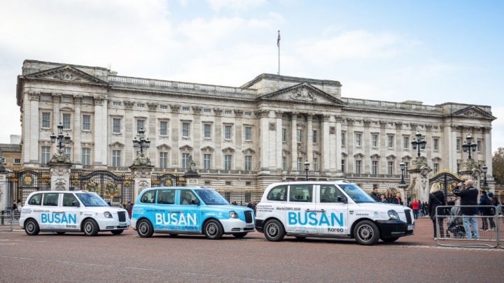 ▲삼성전자가 영국에서 런던의 명물인 ‘블랙캡’을 ‘부산엑스포 택시’로 꾸미고 28일까지 부산엑스포 유치를 기원하는 광고를 진행한다.
