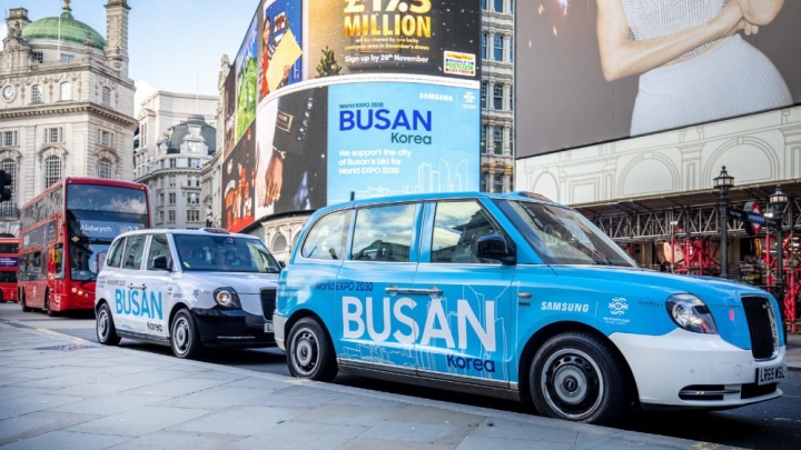 삼성전자가 영국 런던에서 ‘부산엑스포’ 택시를 통해 ‘2030 부산세계박람회(엑스포)’ 막바지 유치전을 지원한다.