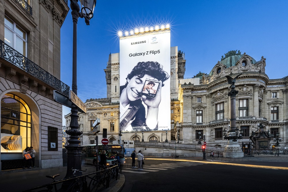 ▲ 삼성전자가 파리의 명소 ‘오페라 가르니에’의 대형 옥외광고에 ‘갤럭시 Z 플립5’ 이미지와 함께 부산엑스포 로고를 함께 선보였다.