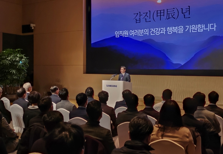 ▲ 삼성전자가 2일 수원 디지털 시티에서 개최한 ‘2024년 시무식’에서 한종희 대표이사 부회장이 신년사를 하고 있다