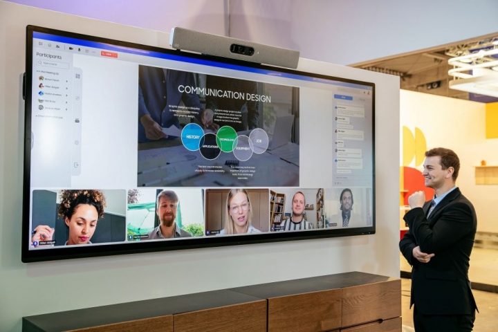 ▲ 삼성전자가 1월 30일부터 2월 2일(현지시간)까지 스페인 바르셀로나에서 개최되는 유럽 최대 디스플레이 전시회 ‘ISE 2024’에 참가해 비즈니스 환경에서도 초연결 경험이 가능한 다양한 상업용 디스플레이 신제품을 소개한다. 삼성전자 모델이 시스코와 파트너십을 강화해 화상회의에 최적화된 105형 스마트 사이니지를 소개하는 모습