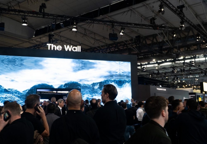 ▲삼성전자 전시장를 찾은 관람객들이 입구에 설치된 ‘더 월(The Wall)’과 투명 마이크로 LED를 살펴보고 있는 모습