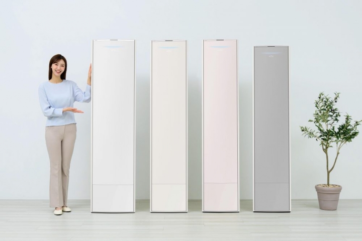 ▲ 삼성전자가 에너지 절약 기능을 강화한 2024년형 비스포크 무풍에어컨을 출시한다고 26일 밝혔다. 삼성전자 모델이 스탠드형 ‘비스포크 무풍에어컨 갤러리’ 신제품을 소개하는 모습
