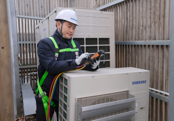 ▲ 삼성전자서비스 엔지니어가 에어컨 사전점검 서비스를 제공하는 모습