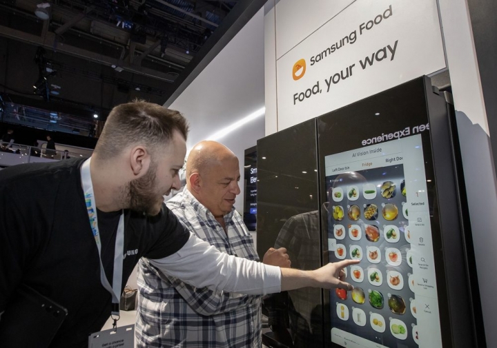 ▲ CES 2024가 열리고 있는 미국 라스베이거스 컨벤션 센터 삼성전자 전시관에서 관람객들이 ‘비스포크 냉장고 패밀리허브 플러스’를 구경하고 있다.