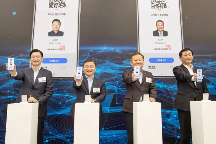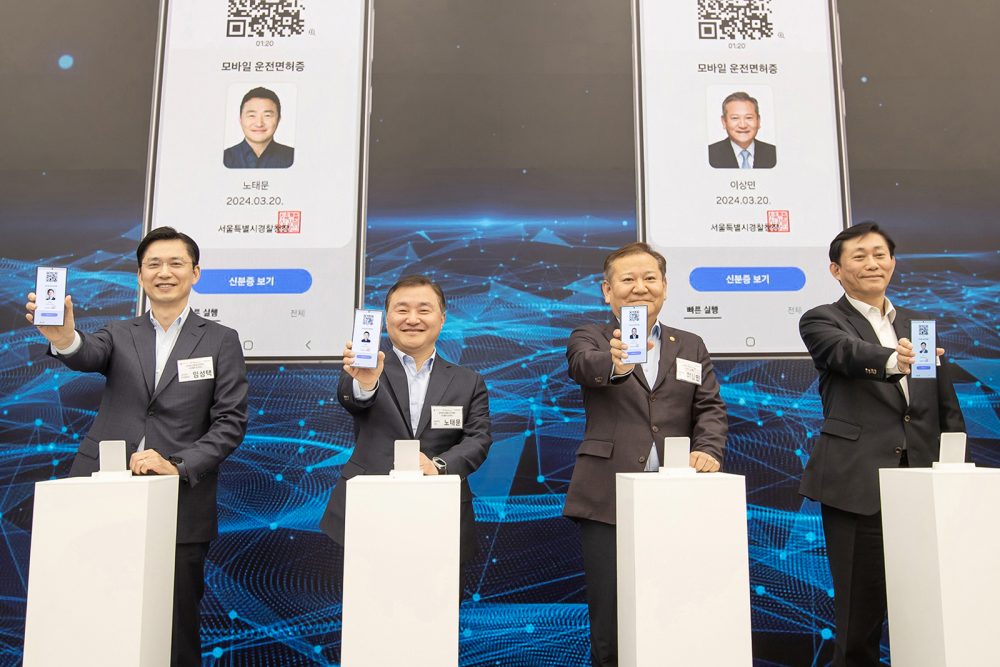 ▲20일 서울 서초구에 위치한 플래그십 스토어 삼성 강남에서 진행된 ‘모바일 신분증 민간개방 삼성월렛 오픈’ 행사 사진, 왼쪽부터 삼성전자 한국총괄 임성택 부사장, 삼성전자 MX사업부장 노태문 사장, 행정안전부 이상민 장관, 디지털플랫폼정부위원회 고진 위원장