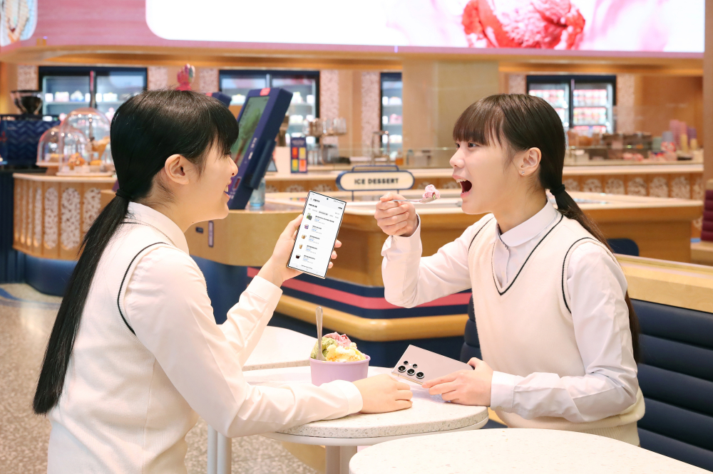 ▲ 학생들이 배스킨라빈스에서 삼성월렛의 ‘선물하기’ 기능을 살펴보는 모습