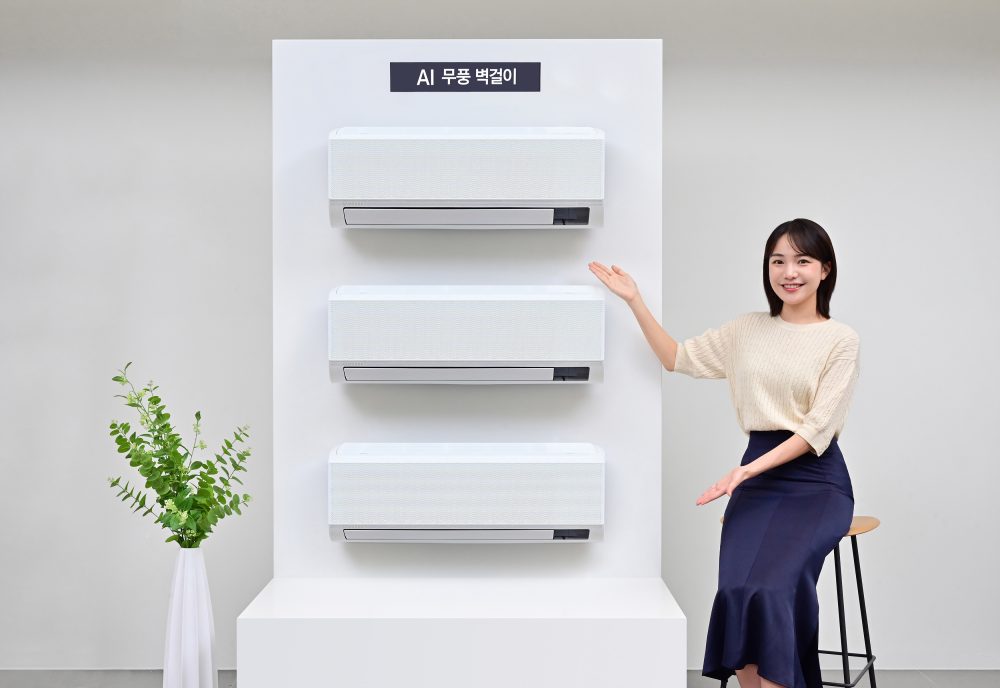 ▲삼성전자 모델이 삼성스토어 청담점에서 ‘2024년 에너지효율개선사업 냉방 지원기기 보급사업자 선정’ 공급 모델인 ‘AI 무풍 벽걸이’를 소개하는 모습