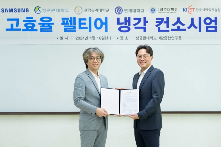 ▲ 지난 16일 경기도 수원에 위치한 성균관대학교에서 삼성전자 DA사업부 선행개발팀장 위훈 부사장(오른쪽)과 성균관대 김성웅 교수(왼쪽)가 함께 고효율 펠티어 냉각 연구 컨소시엄을 체결했다.