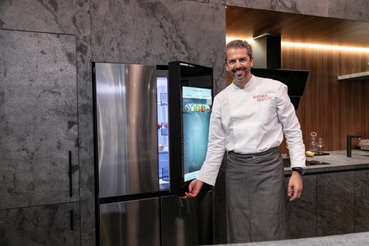 ▲ 안드레아 버튼이 ‘비스포크 AI 패밀리허브’ 냉장고의 ‘AI 비전 인사이드’ 기능을 시연하고 있다