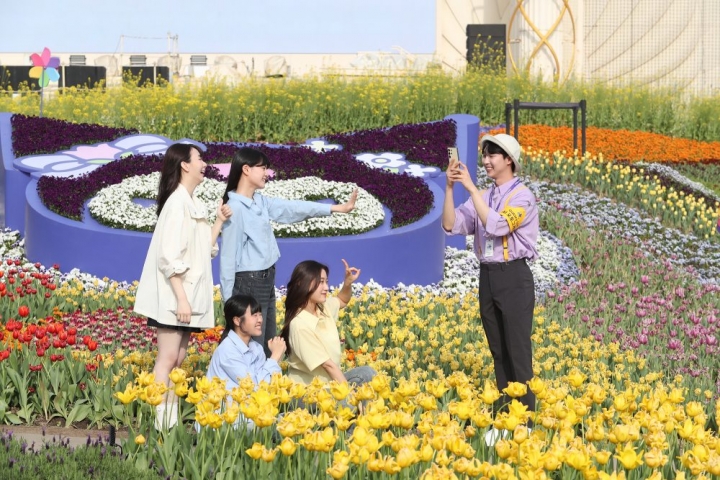 ▲ 에버랜드 포시즌스 가든에서 AI 전문 사진작가가 ‘갤럭시 S24 울트라’로 방문객들의 사진을 촬영하고 있다.