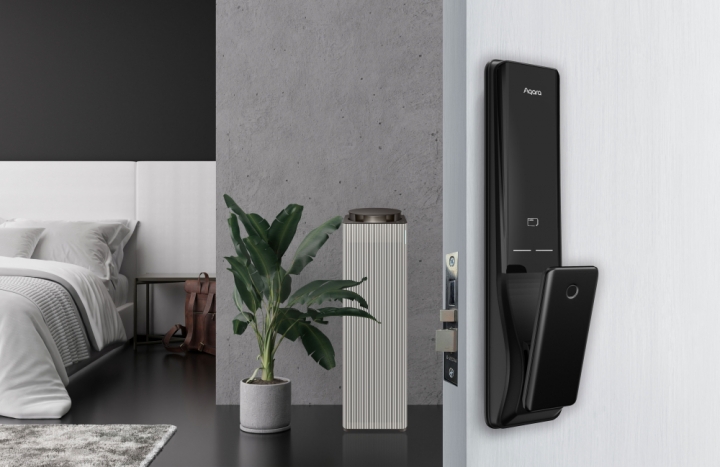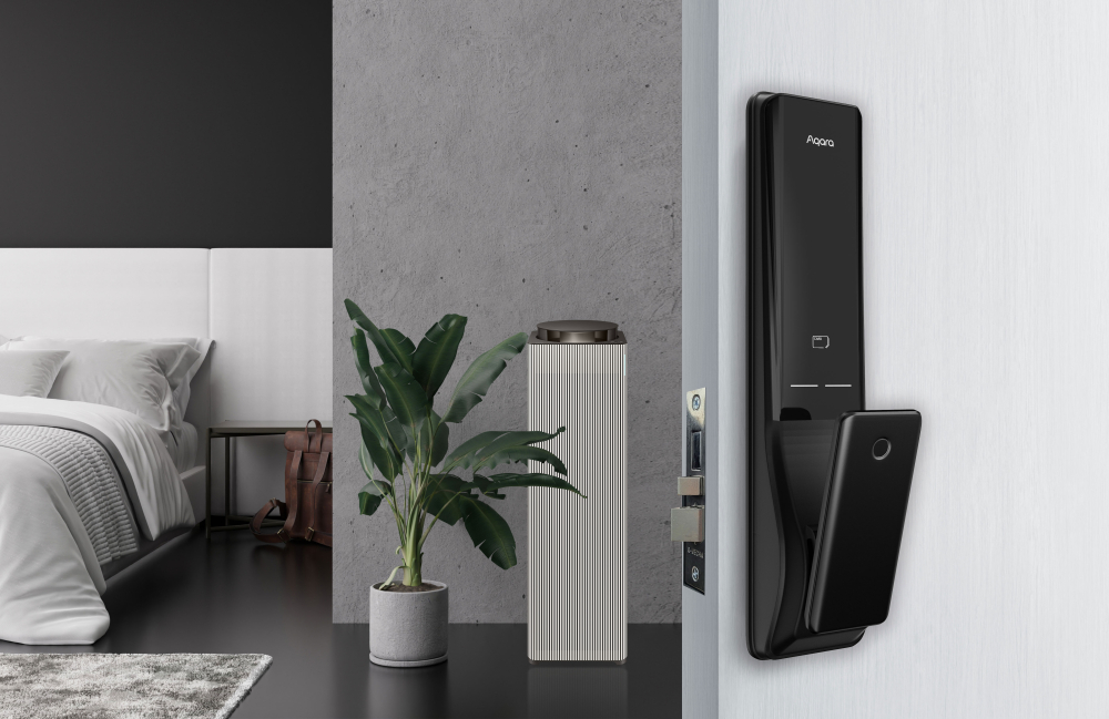 ▲ 스마트싱스에 연동된 삼성전자 공기청정기 비스포크 큐브 에어 인피니트 라인 제품과 아카라 스마트 도어록 K100 제품 이미지