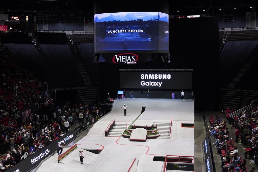 ▲ 지난 20일(현지시간) 미국 샌디에이고에서 열린 ‘스트리트 리그 스케이트보딩’ 결승전 중 삼성전자의 다큐멘터리 1부 ‘콘크리트 드림(Concrete Dreams)’이 상영되는 모습