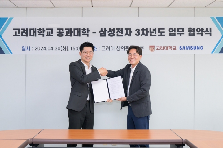 ▲ 서울 성북구의 고려대 창의관에서 삼성전자 DA사업부 위훈 부사장(오른쪽), 연구센터장인 고려대 이호성 교수(왼쪽)가 함께 ‘친환경 에너지 연구센터’ 3차년도 산학협력 협약식을 체결했다.