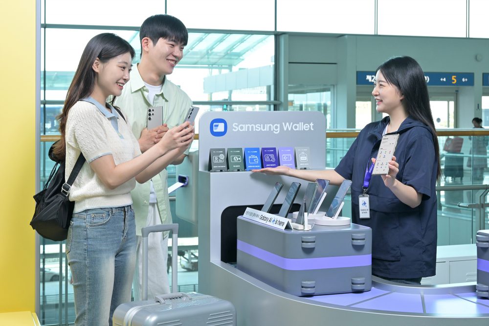 ▲인천공항 제2여객터미널 3층에 위치한 ‘갤럭시 스튜디오’에서 여행객이 새로워진 삼성월렛과 ‘갤럭시 AI’가 적용된 제품을 체험하고 있다.