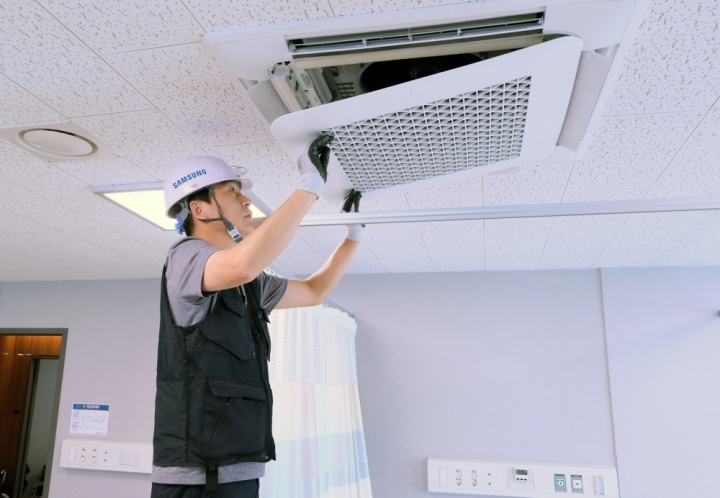 ▲ 삼성전자서비스 엔지니어가 여름을 대비해 다중이용시설(병원)에서 에어컨을 점검하고 있다.