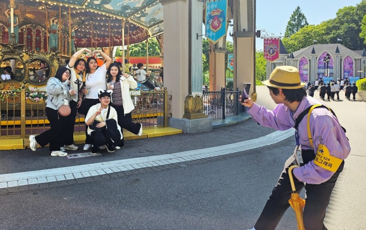 ▲ AI 전문 사진작가가 에버랜드 인기 어트랙션 ‘로얄쥬빌리캐로셀’에서 ‘갤럭시 S24’로 1020세대 방문객들의 기념 사진을 촬영하고 있다.