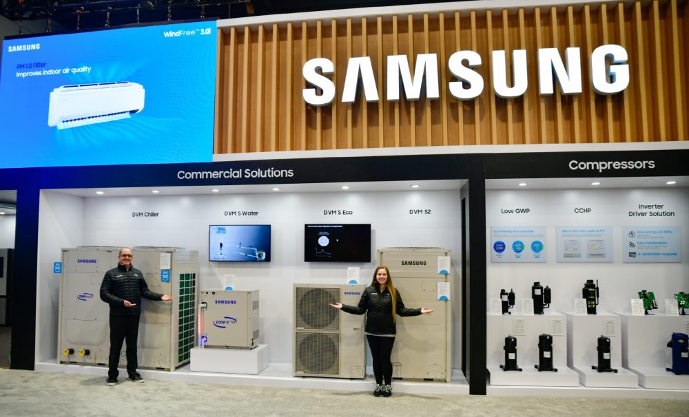 ▲ 삼성전자가 미국 시카고에서 개최되는 북미 최대 공조 전시회 ‘2024 AHR 엑스포’에 참가해 혁신적인 공조 솔루션을 선보인다. 삼성전자 모델이 DVM 라인업을 소개하고 있는 모습