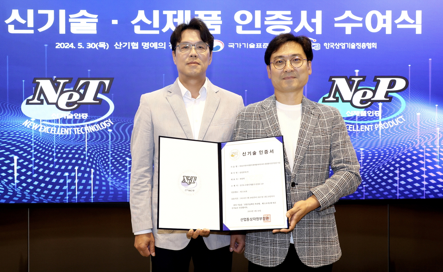 ▲지난 30일 서울 서초구 한국산업기술진흥협회 명예의 전당에서 삼성전자 청정연구센터 이기섭 센터장(왼쪽), 삼성전자 청정연구센터 노형수 프로(오른쪽)가 ‘신기술 인증서’를 받은 모습