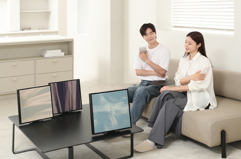 ▲ 삼성전자 모델이 ‘뮤직 프레임 X 지용킴’ 스페셜 에디션과 함께 음악을 감상하고 있다.