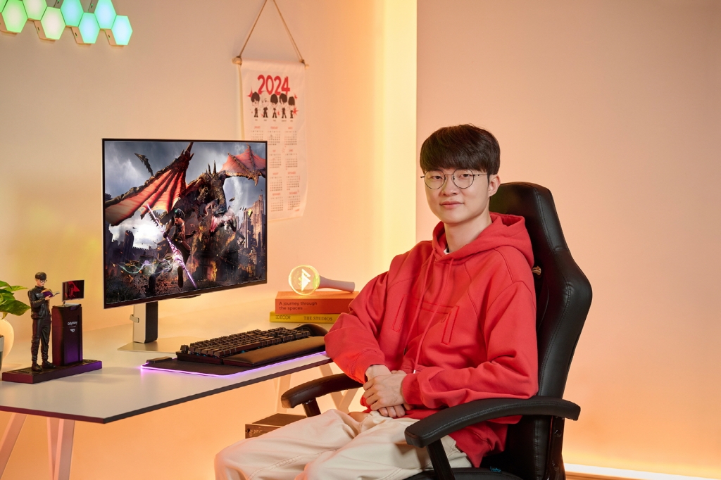 ▲ T1 페이커 선수가 삼성전자 OLED 게이밍 모니터 ‘오디세이 OLED G8(G80SD)’을 소개하고 있다.