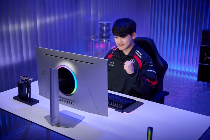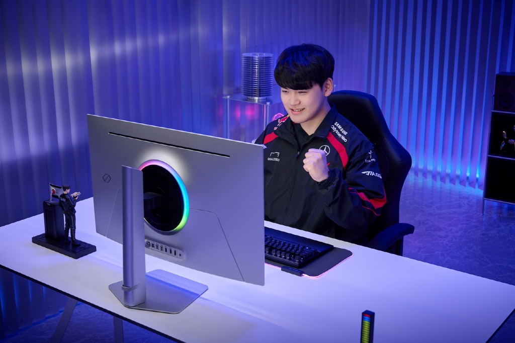 ▲ T1 구마유시 선수가 삼성전자 OLED 게이밍 모니터 ‘오디세이 OLED G8(G80SD)’을 소개하고 있다.