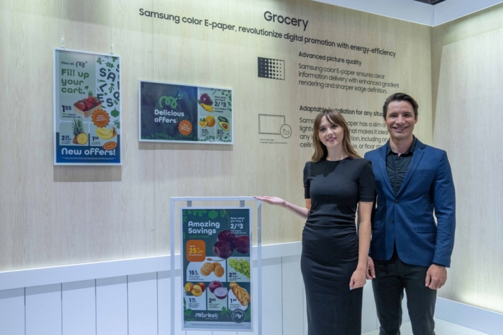 ▲ 미국 라스베이거스에서 열리는 북미 최대 디스플레이 전시회인 ‘인포콤(Infocomm) 2024’ 에서 삼성전자 모델이 전력 공급 없이 디지털 콘텐츠 광고가 가능한 신개념 사이니지인 ‘삼성 컬러 이페이퍼(Color E-Paper)를 소개하고 있다.