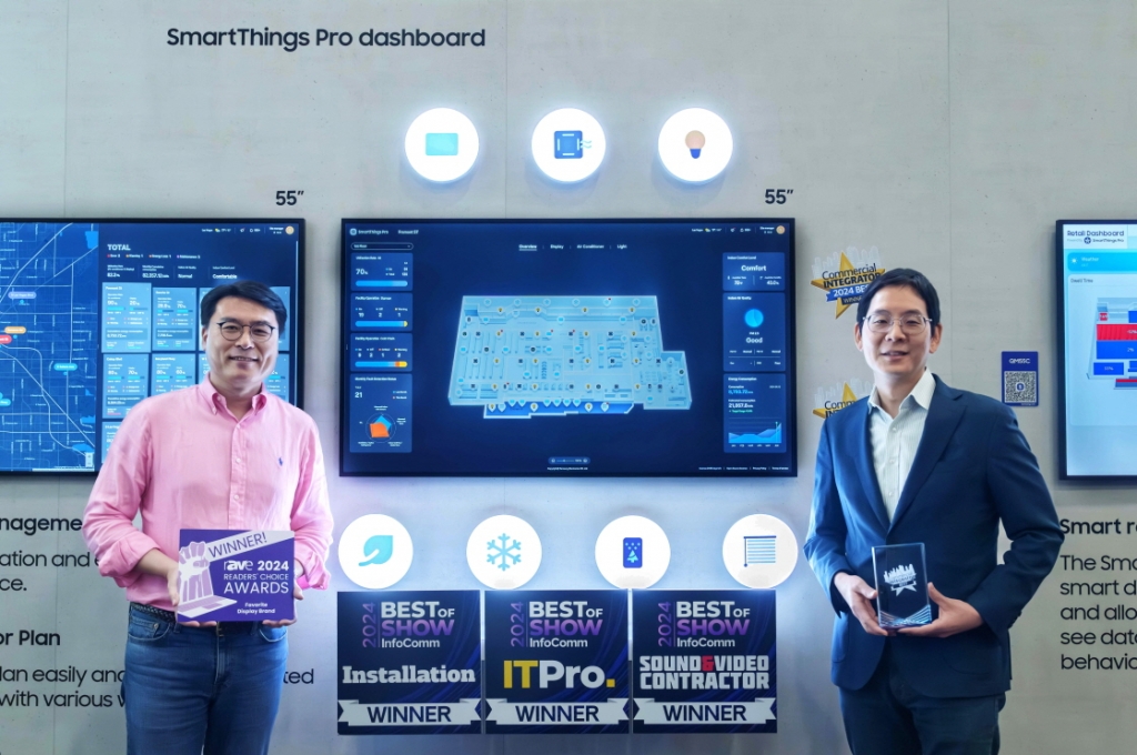 ▲ 지난 6월 12일부터 14일까지(현지시간) 미국 라스베이거스에서 열린 북미 최대 디스플레이 전시회 ‘인포콤(InfoComm) 2024’에서 삼성전자 영상디스플레이사업부 B2B상품기획그룹 이원주 그룹장(왼쪽)과 삼성전자 B2B통합오퍼링센터 B2B솔루션팀 박찬우 부사장(오른쪽)이 어워드 기념 촬영을 하고 있다.