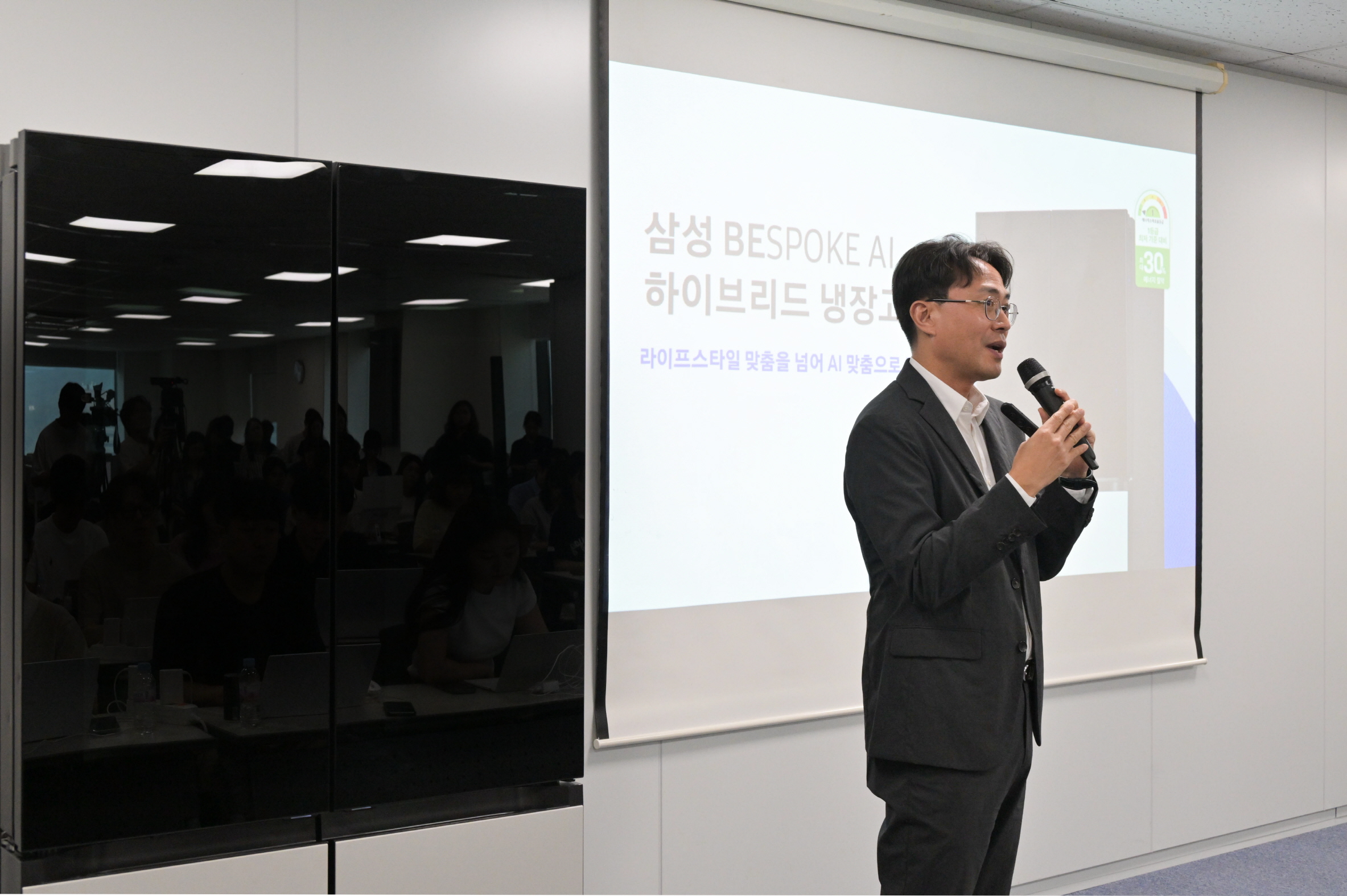 ▲ 삼성전자 냉장고 미디어 브리핑에서 삼성전자 선행개발팀 위훈 부사장이 ‘비스포크 AI 하이브리드’ 냉장고를 설명하고 있다.